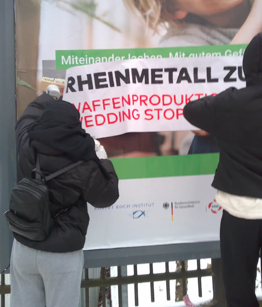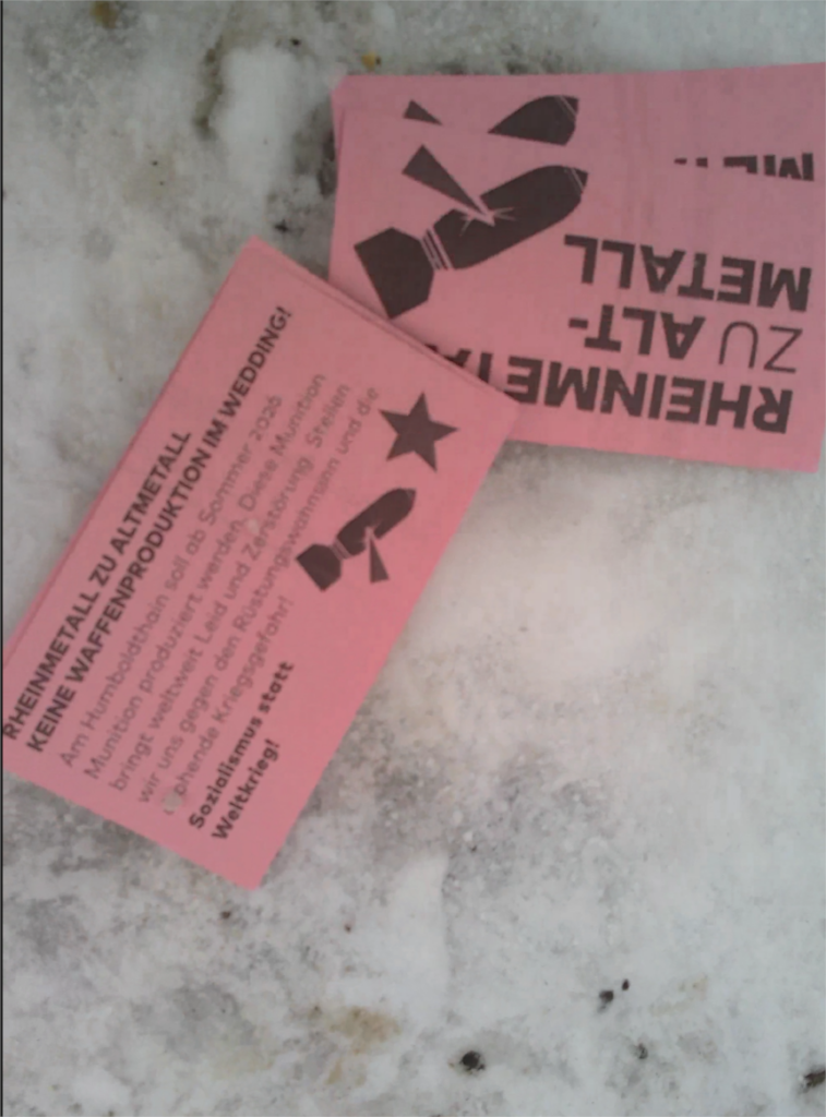 Ein weiteres Banner mit der Aufschrift „Rheinmetall zu Altmetall“ wurde ebenfalls angebracht. Des Weiteren wurden Stencils mit den Slogans „Krieg dem Krieg“, „Sozialismus statt Weltkrieg“ und „No war but class war“ gesprüht. In der Nähe des Geländes wurden Wandzeitungen verklebt, um die Beschäftigten und Anwohner*innen über die Hintergründe von Militarisierung und Aufrüstung zu informieren. Es wurden auch kleine Schnipsel verstreut mit dem Text: „Keine Waffenproduktion im Wedding!