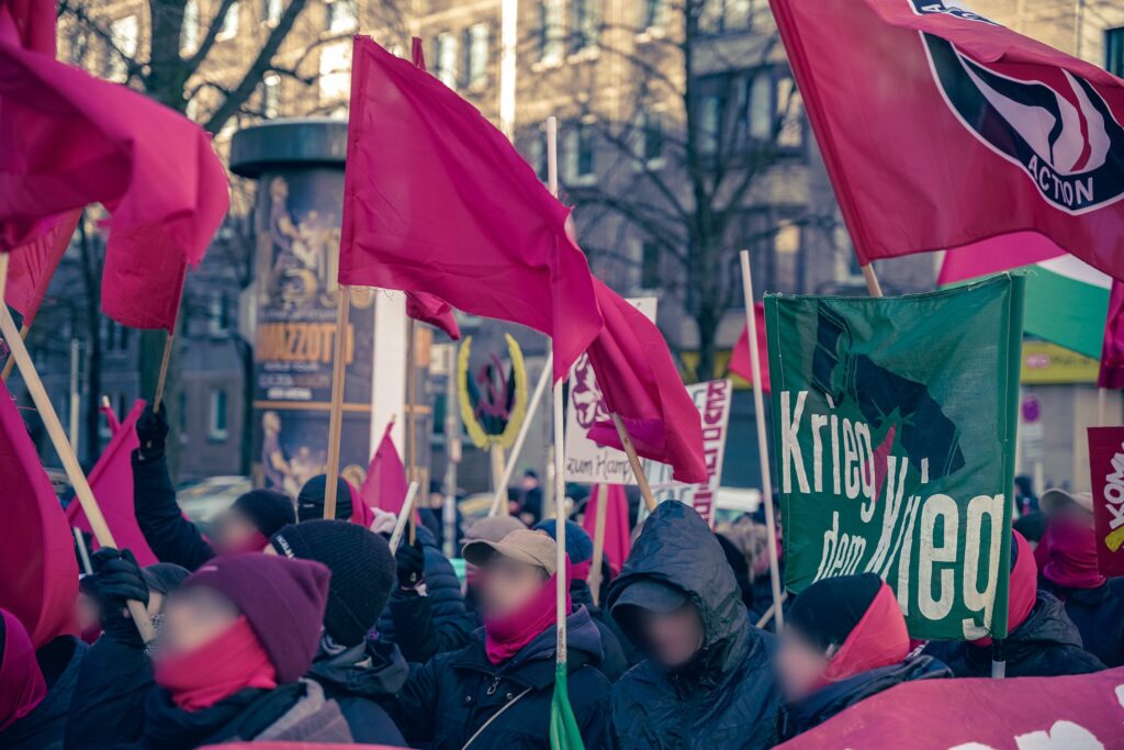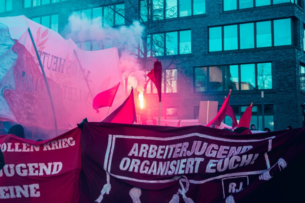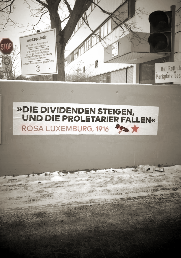 Außerdem wurde ein Banner mit dem Zitat von Rosa Luxemburg aus dem Jahr 1916 angebracht, welches lautet: „Die Dividenden steigen und die Proletarier fallen“. Angesichts der aktuellen Lage, die geprägt ist von kapitalistischer Krise, Rüstungswahnsinn und der Gefahr eines Weltkrieges, ist dieser Ausspruch hochaktuell. Die Reichen rüsten zum Krieg, auf Kosten der Arbeiter*innen weltweit.