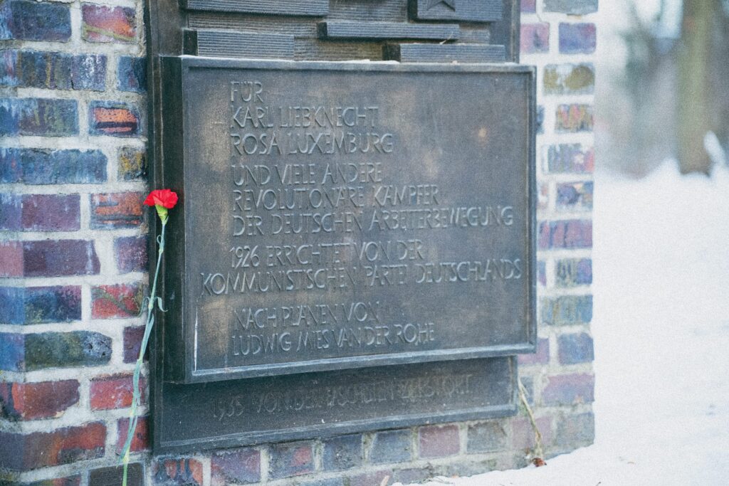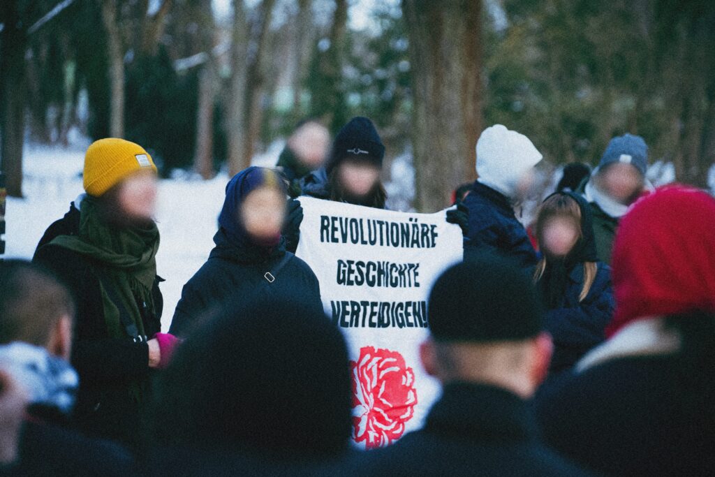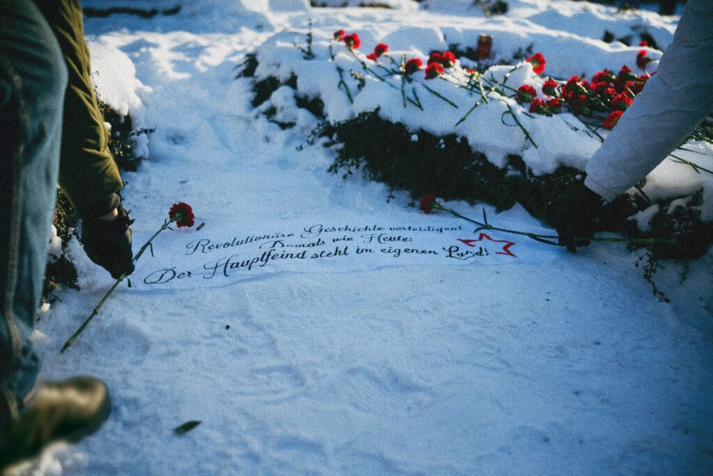Am Anschluss versammelten wir uns mit weiteren Genoss:innen aus dem revolutionären Block auf dem vorderen Teil des Friedhofs, an der Gedenkstätte der Sozialisten, die 1951 als Gedenkort für Sozialist:innen und Kommunist:innen verschiedener Generationen und als Bestattungsort für Sozialist:innen der DDR errichtet wurde. Mit starken Reden, roten Nelken, bei Heißgetränken und strahlendem Sonnenschein gestalteten hunderte Genoss:innen sich ein eigenes, angemessenes Gedenken.