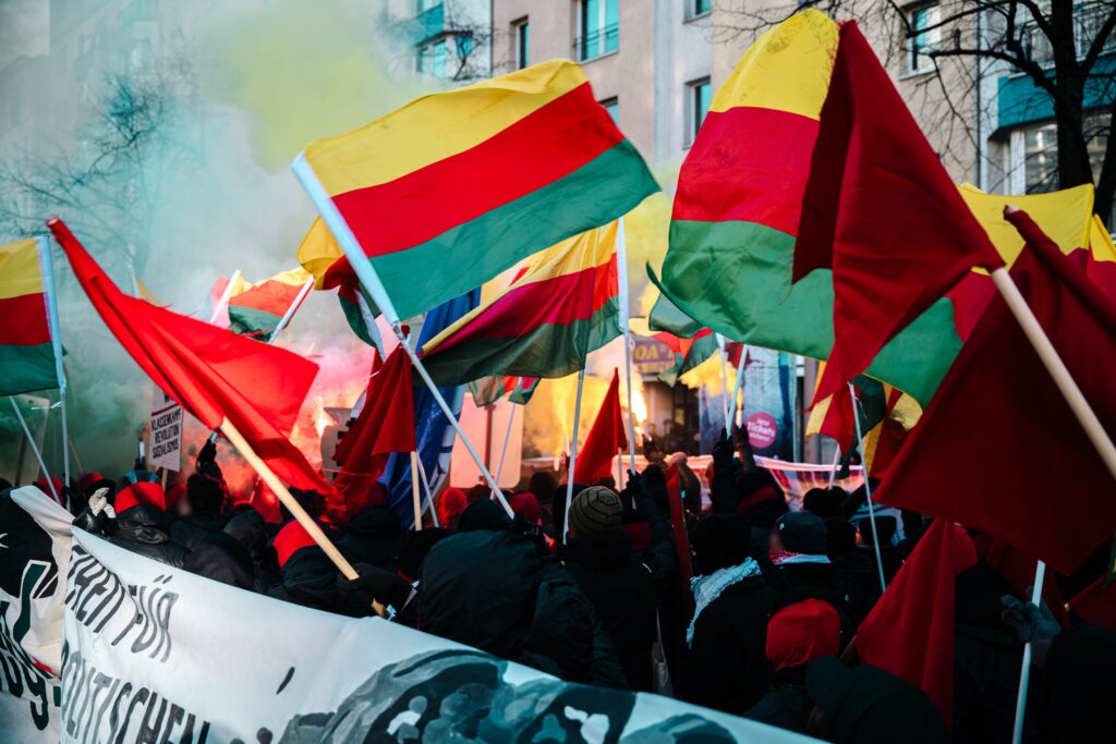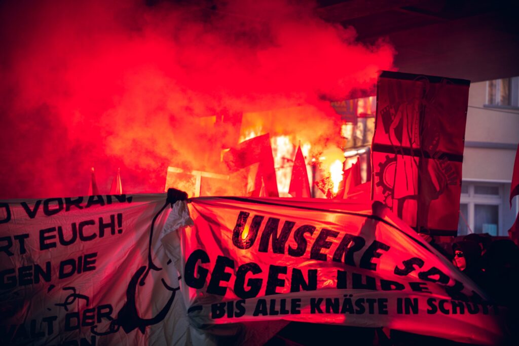 Ein besonderer Fokus im Block war die aktuelle Situation in Aleppo in Syrien, wo die von der Türkei und westlichen Imperialisten unterstützten HTS-Dschihadisten die kurdischen Stadtviertel Sheikh Maqsoud und Ashrafiya mit schweren Waffen angegriffen, Zivilist:innen ermordet, verschleppt und zur Flucht gezwungen haben. Das ist ein Teil des Kriegs der neuen syrischen Machthaber gegen die Rojava-Revolution, gegen ein multi-ethnisches und demokratisches Syrien. Die EU-Kommission mit der Deutschen von der Leyen an ihrer Spitze hat dem neuen Regime fast zeitgleich Finanzhilfen in Höhe von 620 Millionen Euro zugesichert. Die Bevölkerung in den Vierteln und in anderen Teilen Syriens organisiert sich und mobilisiert Widerstand von unten gegen die Angriffe. Schon bei den Angriffen des türkischen Staates und seiner Proxies auf den Tishrin Damm hat eine mutige und unnachgiebige Mobilisierung der Bevölkerung den militärischen Widerstand der Volksverteidigungskräfte ergänzt. Diesen Widerstandsgeist gilt es jetzt international zu unterstützen! In unserem Block gab es zu Beginn ein Grußwort der internationalen Vernetzung Riseup4Rojava. Später haben revolutionäre Internationalist:innen eine Aktion mit Fahnen, Bengalos und Rauch in den Farben der Selbstverwaltung in Rojava im Block organisiert.
